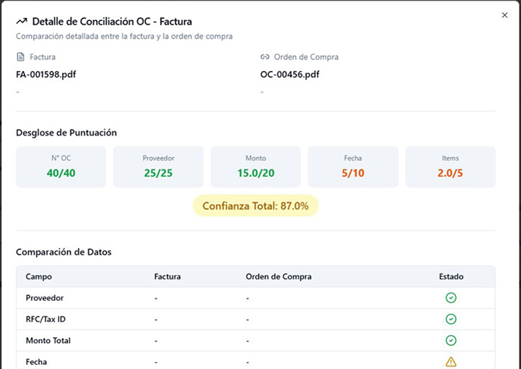 Las facturas son cotejadas con las respectivas órdenes de compra para verificar que datos como montos, ítems y proveedor coinciden correctamente.