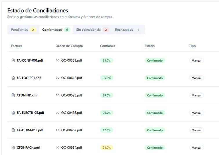 - Visibilidad total del proceso: Conoce en tiempo real el estado de cada factura: desde su recepción, conciliación con OC, hasta su registro contable. Detecta diferencias antes de que generen retrasos en pagos o fricciones entre áreas.